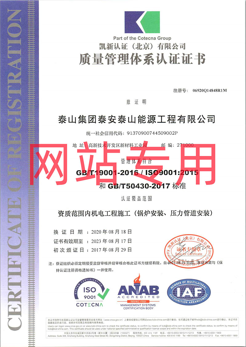 質(zhì)量管理體系認(rèn)證證書(鍋爐、壓力管道安裝)